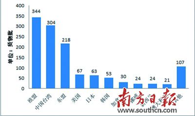 隨著進口食品種類需求多樣,我國進口食品的來源也越廣泛。據(jù)調(diào)查,我國從179個國家或地區(qū)進口食品55.2萬批、2035.2萬噸、222.3億美元,同比分別增長11.9%、21.2%和-10.8%。其中進口食品貿(mào)易額列前10位的分別為:歐盟、東盟、美國、新西蘭、巴西、澳大利亞、俄羅斯、加拿大、烏克蘭和韓國,共177.0億美元,占我國進口食品貿(mào)易總額的79.6%。