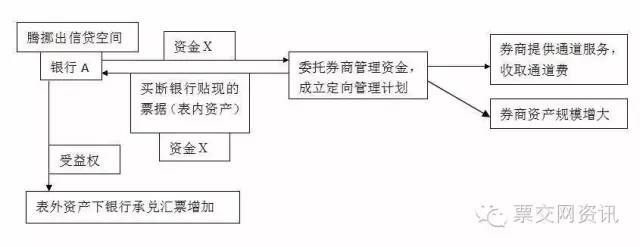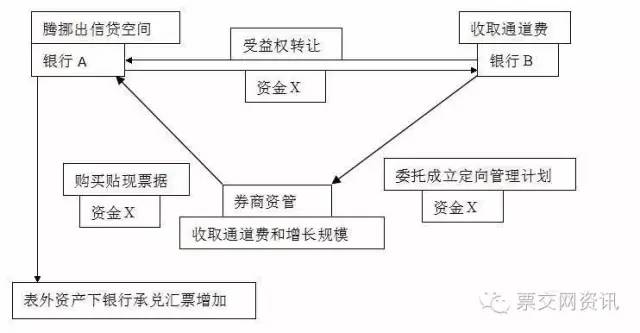 流程:銀行C將自有資金X委托券商資產管理部門成立定向資產管理計劃,券商定向資產管理計劃用于購買銀行B的票據資產(同時銀行A已將自己的票據轉讓給銀行B),銀行C將擁有的資產管理計劃受益權轉讓銀行A。