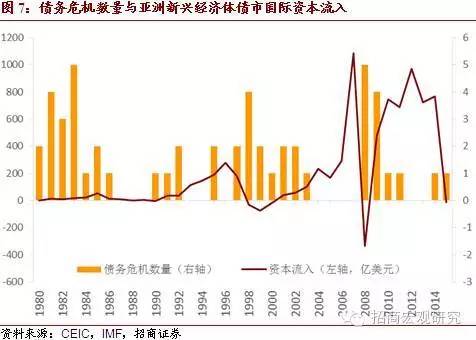 由圖7可見(jiàn),全球風(fēng)險(xiǎn)情緒,新興經(jīng)濟(jì)體出現(xiàn)債務(wù)危機(jī)的數(shù)量,與亞洲乃至全球國(guó)際資本流動(dòng)形勢(shì)有密切關(guān)系。當(dāng)新興經(jīng)濟(jì)體增長(zhǎng)狀況好,全球流動(dòng)性寬裕,出現(xiàn)危機(jī)的可能性小,全球風(fēng)險(xiǎn)狀況平穩(wěn)時(shí)期,國(guó)際資本大舉涌入新興經(jīng)濟(jì)體,形成正反饋;當(dāng)全球流動(dòng)性環(huán)境收緊,新興經(jīng)濟(jì)體已有危機(jī)出現(xiàn),全球風(fēng)險(xiǎn)狀況緊張,新興經(jīng)濟(jì)體國(guó)際資本流入急轉(zhuǎn)直下,形成負(fù)反饋。針對(duì)當(dāng)前這一輪國(guó)際資本從整個(gè)新興經(jīng)濟(jì)體的外流原因,國(guó)際貨幣基金組織認(rèn)為應(yīng)主要?dú)w因于新興經(jīng)濟(jì)體國(guó)內(nèi)日趨減緩的經(jīng)濟(jì)增速。此外,2015年以來(lái)美聯(lián)儲(chǔ)趨于緊縮的貨幣政策這一國(guó)際因素的影響也不容忽視。