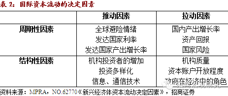 一般而言,有學(xué)者將影響國(guó)際資本流動(dòng)的因素分為“引力(Pull)”與“推力(Push)”兩類,“引力”因素指新興經(jīng)濟(jì)體國(guó)內(nèi)因素,包括經(jīng)濟(jì)增長(zhǎng)速度、投資回報(bào)率、利率、資本市場(chǎng)開放程度等等;“推力”因素指國(guó)際因素,包括全球風(fēng)險(xiǎn)情緒、發(fā)達(dá)國(guó)家特別是美國(guó)的經(jīng)濟(jì)增長(zhǎng)速度和貨幣政策松緊程度等等。另外一些學(xué)者從影響因素的波動(dòng)特征角度,將影響國(guó)際資本流動(dòng)因素分為周期性因素和結(jié)構(gòu)性因素(見(jiàn)下表2)。