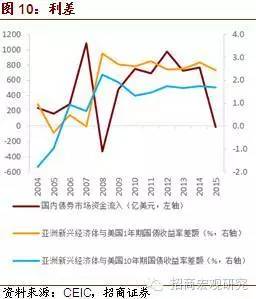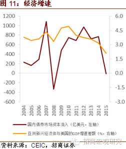 2015年債券市場(chǎng)國(guó)際資本流動(dòng)處于周期的低位。2014至2015年,亞洲新興經(jīng)濟(jì)體債券市場(chǎng)國(guó)際資本流入規(guī)模下降,甚至轉(zhuǎn)為流出,可以說(shuō)處于周期的低位。如果從過(guò)去的經(jīng)驗(yàn)看,資本流出時(shí)期的長(zhǎng)度一般為2年,似乎流出期已經(jīng)結(jié)束。此外,從2016年亞洲各主要新興經(jīng)濟(jì)體債券市場(chǎng)的的最新情況看,國(guó)際資本外流的壓力似乎已經(jīng)明顯減輕。盡管我們從資本外流的絕對(duì)和相對(duì)規(guī)模看,斷言這輪資本外流期已經(jīng)終結(jié)還有一點(diǎn)爭(zhēng)議,但的確存在新周期已于2016年開始的可能性。