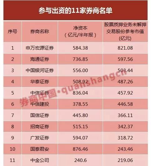 參與出資的這11家券商都是大型的上市券商,分別是中信、海通、國泰君安、申萬宏源、國信、銀河、華泰、招商、廣發、中信建投、中金公司。