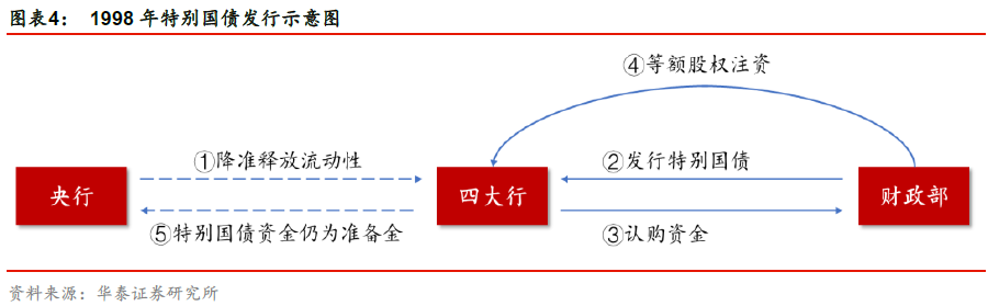 第二步,財政部向四大行發(fā)行2700億元特別國債,四大行通過央行降準(zhǔn)獲得的資金進(jìn)行認(rèn)購。