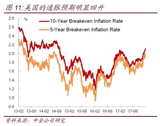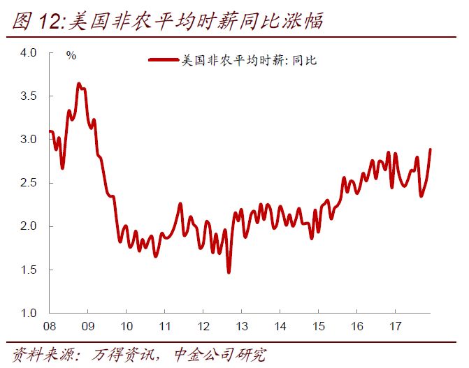 年初以來,美國國債收益率的上升主要有幾方面的原因:(1)經濟復蘇預期和風險偏好上升。年初以來,全球風險偏好明顯上升,股市走強,商品上漲,美元走弱,而風險偏好的上升背后源于經濟復蘇的預期。在這種背景下,債券收益率也隨之上升。(2)通脹預期上升。經濟復蘇預期升溫以及油價的上漲帶來了通脹預期的上升。此外,美元指數明顯走弱,也可能對美國帶來輸入性通脹。觀察TIPS所隱含的通脹預期,目前也回升到了最近幾年的高位(圖11)。(3)美元走弱背景下,境外央行減持美債以及美債供給增加導致的供需矛盾。我們在上周周報《弱美元反映了什么,是喜是憂?》中提到,隨著美元的持續走弱,美元資產的吸引力在下降,尤其是海外央行在逐步減持美國債券。但在特朗普稅改的驅動下,美國財政赤字有一定幅度的提升,這也增加了美國國債的供給。疊加美聯儲縮表,美國國債的供需關系轉差,推動了美國國債收益率的上升。(4)周五公布的非農就業數據給予美債市場最后的重創。1月份美國非農就業人口增加20萬,超過市場預期的18萬,失業率維持在4.1%低位。但更關鍵的是每小時工資漲幅達到2.9%(圖12),明顯高于市場預期,創2009年以來最大增幅。此前美國通脹預期一直起不來的一個重要原因是雖然就業復蘇,但工資上漲緩慢,抑制通脹。如果工資漲幅開始加速,那么通脹壓力也將隨之而來,尤其是弱美元也會增加美國的商品進口成本,帶來輸入型通脹壓力。在這個數據的推動下,市場對美聯儲今年的加息預期進一步升高,也帶動了美國國債收益率的大幅上升。