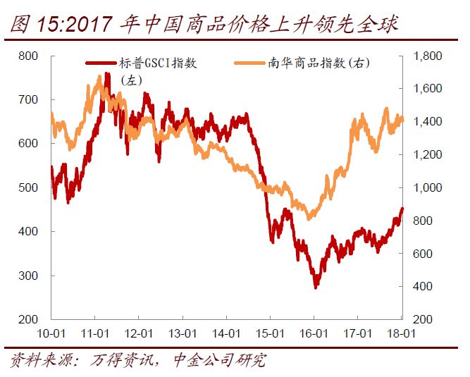 不僅中國的債券收益率上升去年領先于全球,中國的商品價格上升和經濟復蘇也是領先于全球的(圖15)。中國的供給側改革帶動了大部分工業品價格的大幅上漲,是這一輪全球大宗商品價格回升的主因。而中國的供給側改革以及居民加杠桿帶來了更強的進口需求,從而也通過拉動海外國家的出口來形成了這一輪全球經濟共振的復蘇。