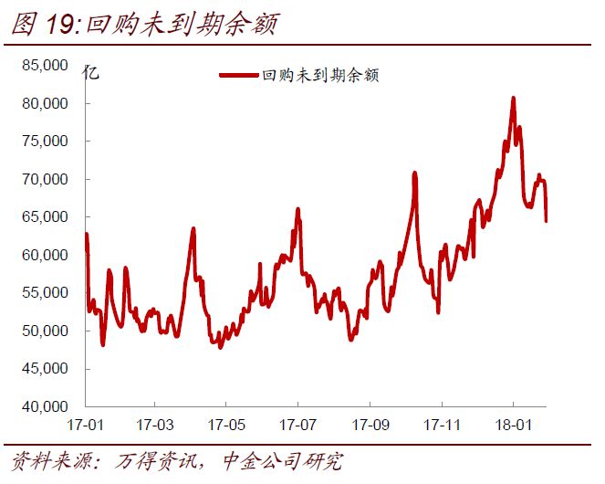 不過,貨幣當局目前也不是轉向了放松,只是政策統籌層面的緩沖。而且,在吸取去年6-7月份階段性放松后非銀金融機構又很快的把債券杠桿提升回來的教訓,這次貨幣當局對于流動性的適度寬松也有所保留。體現在銀行減少了對非銀機構的隔夜資金融出,隔夜回購成交量有所減少。而銀行對非銀的回購融出更多是體現在7天以上的長期限資金。從存量角度來看,1天回購未到期余額的比例也在逐步下降(圖18)。由于302號文抑制了很多中小券商和銀行的加杠桿空間,導致目前債券杠桿的需求有所放緩。年初以來,債券未到期回購的余額也在逐步下降(圖19)。疊加CRA的流動性釋放,我們估計今年春節前后的資金面要較往年更為寬松,貨幣市場利率可能保持目前水平或者進一步小幅下降。這有利于債券收益率在春節前后保持平穩,而不是跟隨海外債券收益率上升。