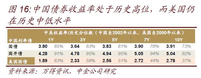 鑒于中國才是這一輪全球經濟復蘇和資產價格變動的領頭羊,中國債券和美國債券的關系實際上不是跟隨關系,而是領先關系。因此,當投資者都很擔心美國國債收益率大幅上升可能拉動中國也大幅上升的時候,我們想強調,中國其實在去年已經大幅上升過了。今年中國的債券收益率很難再出現去年那么明顯的升幅。因為目前中國債券收益率已經回升到歷史90%分位數以上了,而美國的中長期國債收益率還沒有回到50%分位數以上,依然是歷史上中等偏低的水平(圖16)。