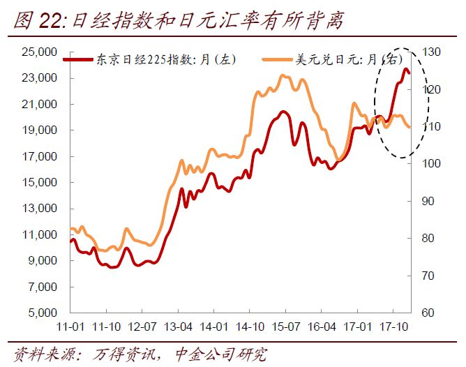 短期內需要關注全球風險偏好的變化是否會對國內債市帶來小幅的交易機會;而中期內需要關注債券供需關系的矛盾;全年來看,債券是否有趨勢性機會取決于基本面的變化。盡管由于金融嚴監管導致廣義流動性收緊,債券投資者普遍看空債市。但是,最近國內資金面開始轉松,貨幣政策態度更為友好,加上海外債券收益率持續快速上升導致風險偏好開始發生變化,從短期的角度來看,國內債券市場未必沒有交易性機會。尤其是上周五全球股市暴跌,商品價格也因此回落,這種風險偏好的下降值得關注,如果增強或者擴散,那么在情緒的渲染下,國內股市有可能短期還會調整,而債市可能會存在一定的交易性機會。畢竟全球股市已經持續上升了較長時間(圖20),一直沒有像樣的調整,而這次美國國債收益率的快速上升成為了調整的觸發劑。畢竟過去這些年,全球資產價格的上漲,很大程度上是依賴于寬松的貨幣政策環境,一旦全球貨幣政策加速退出,利率重新明顯抬升,對風險資產的定價會產生較大的影響。而且從很多跡象來看,這次全球風險偏好上升的強度是遠高于歷史平均水平的,而且也擺脫了一些慣常的經驗規律。比如美國和歐洲的利差持續擴大,但美元反而是走弱的(圖21);日元相對于美元走強,但日本股市反而也是走強的(圖22);中國的大小盤股的走勢也出現了明顯的分化。這些都源于對經濟復蘇的非常強的預期。但這種預期其實有待于驗證。一旦有一些不利因素,這種過強預期是容易面臨修正的。而資金可能會從風險資產回流到債券等無風險資產。尤其是對于目前利率已經處于歷史高位的中國債券而言,本身已經具備長期配置價值,一些情緒上的渲染和變動是有可能帶來短期的交易性機會的,尤其是10年國開這種流動性比較好的交易性資產。