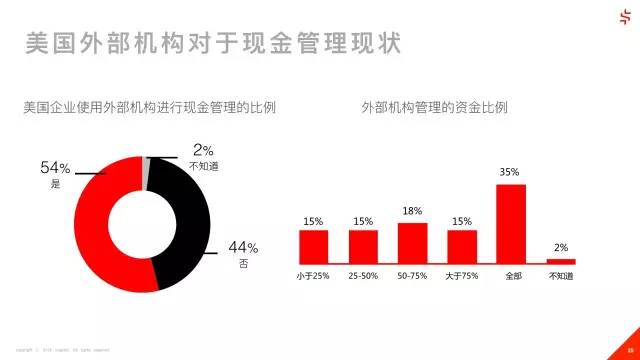 外包化的運作模式具體來說,一方面,在運作模式上,54%(見下圖)的美國企業都選用外部機構進行現金管理,44%趨向于“in house”,即自己找人做。值得注意的是,量化寬松下的低利差環境幾乎從源頭上阻斷了美國本土從事現金理財的專業機構的生長,這也導致一部分欲尋求外部合作的企業分流至“in house”陣營,可以預測,如果復制到中國市場,這兩部分比例差距會更大。