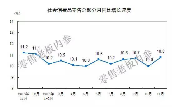 從同比看,11月份社會消費品零售總額同比增長10.8%,增速比10月份加快0.8個百分點,比1至10月份提高0.5個百分點。從環比看,經季節調整后,11月份社會消費品零售總額環比增長0.97%,增速比10月份加快0.22個百分點。