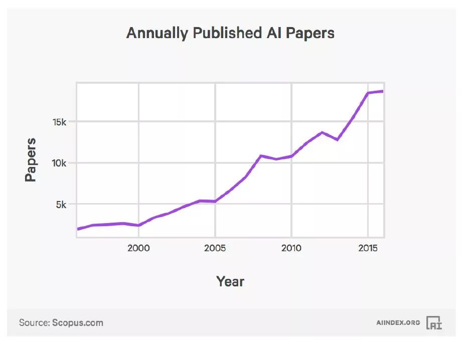 自1996年以來,每年發表的計算機科學的學術論文和研究的數量猛增了9倍以上。學術論文和研究通常能產生新的知識產權和專利。整個Scopus數據庫中,含有“Artificial Intelligence”這個關鍵詞的計算機科學領域的論文有超過200,000(200237)篇。Scopus數據庫中“計算機科學”領域的論文總共有近500萬(4868421)篇。