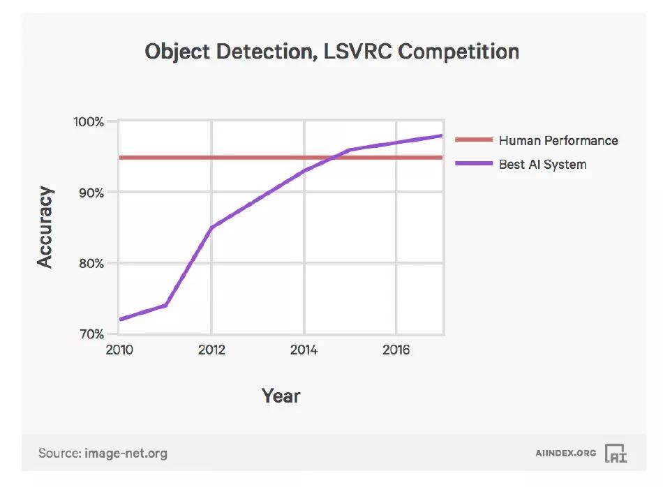 自2010年以來,圖像標注的錯誤率從28.5%下降到2.5%以下。大規模視覺識別挑戰賽(LSVRC)的對象檢測任務的AI拐點發生在2014年。在這項特定任務中,AI已經表現得比人類更準確。這些發現來自于ImageNet網站上LSVRC競賽排行榜的競賽數據。