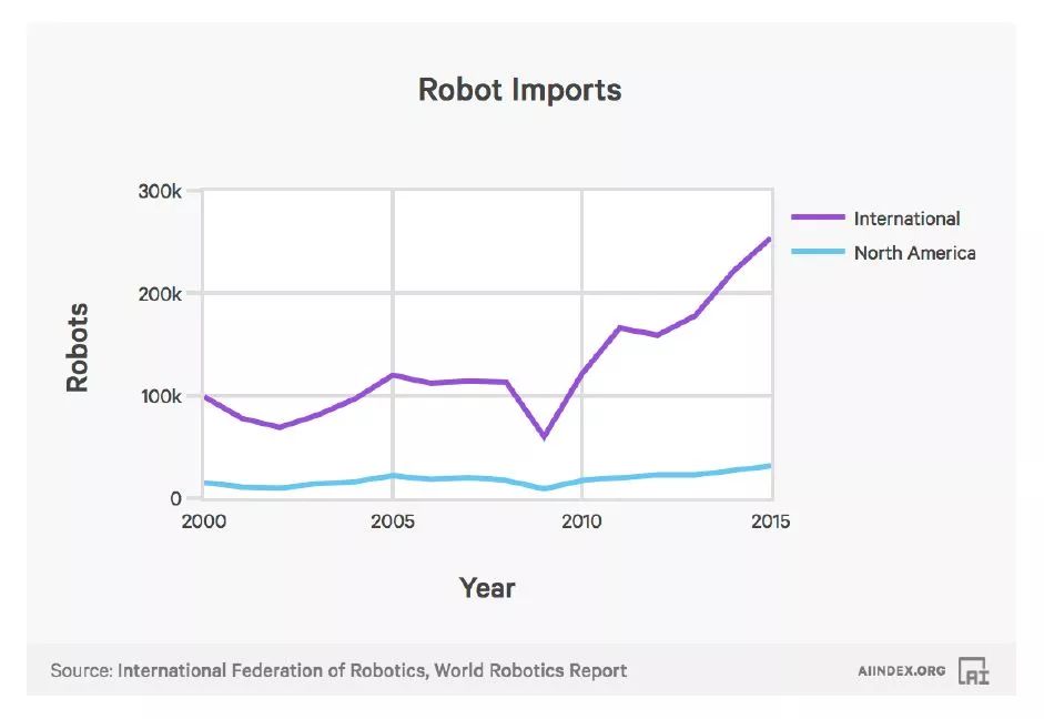 從國際上看,機器人的進口量已經從2000年的10萬臺左右增長到了2015年的25萬臺左右。數據來源是每年進口到北美以及國際整體的工業機器人的數量。工業機器人由ISO 8373:2012標準定義。國際數據公司(IDC)預測對機器人的消費將在五年內加快,到2021年達到2307億美元,復合年增長率(CAGR)為22.8%。