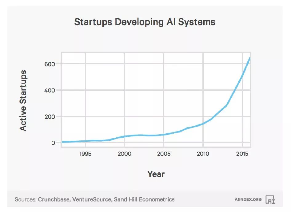 自2000年以來,在美國,有資本支持的 AI 創業公司數量增加了 14 倍。Crunchbase,VentureSource和Sand Hill Econometrics也用于這一分析。這個數字包括VentureSource數據庫中Crunchbase列表中的任何有VC支持的公司。