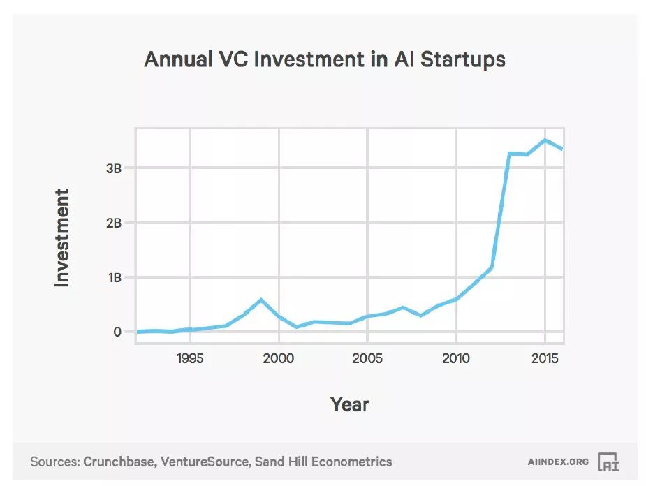 自2000年以來,在美國,風險投資者(VC)每年投入AI創業公司的投資額增加了6倍。Crunchbase,VentureSource和Sand Hill Econometrics被用于確定VC每年投給初創公司的資金額,這些初創公司在某些關鍵領域起著重要作用。上圖顯示了VC在美國所有融資階段對AI創業公司年度投資總額。