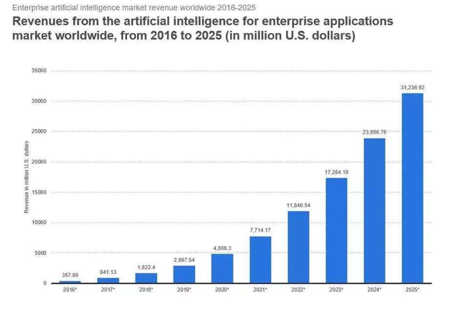 到2025年,來自人工智能企業應用的全球營收預計將從2018年的1.62億美元增長到31.2億美元,漲幅達到52.59%。圖像識別和標記、醫療數據處理、定位和地圖、預測性維護、使用算法和機器學習預測和阻止安全威脅、智能招聘和人力資源系統等等,是企業應用AI的一些用例。