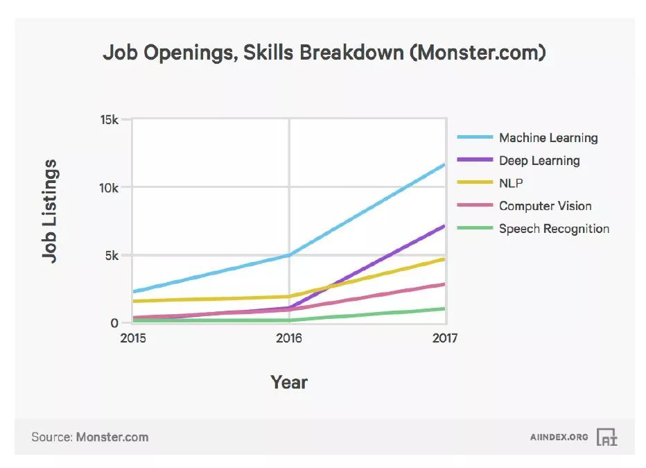 在線求職平臺Monster.com上數據顯示,機器學習,深度學習和自然語言處理(NLP)是最重要的三項技能。兩年前NLP已經被預測會成為應用程序開發人員創建新的AI應用程序最需要的技能。除了創建AI應用程序,最受歡迎的技能還包括機器學習技術,Python,Java,C ++,開源開發環境的經驗,Spark,MATLAB和Hadoop。根據對Monster.com的分析,在美國,數據科學家,高級數據科學家,人工智能顧問和機器學習主管的薪水中位數為$127000。