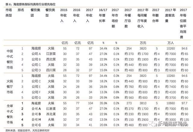 海底撈的年客流量亦屬最高,2017年約有1.03億人次。此外,按若干關鍵績效指標(翻臺率、年度收入及收入增速等)計,海底撈在主要中式餐飲品牌中排名第一;火鍋餐廳市場中,海底撈于2015-2017年市場份額排名第一,2017年達2.2%,高出第二名1.3個百分點;全球中式餐飲市場中,海底撈于2015-2017年市場份額排名第一。2017年海底撈海外收入排名第一,達7.03億元,約為排名第二公司海外收入的3.8倍。