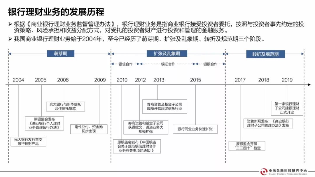 我國商業銀行理財業務始于2004年,先后經歷了萌芽期、擴張及亂象期、轉折及規范期三個階段。《商業銀行理財子公司管理辦法》的頒布,代表著銀行理財業務進入了新的發展時期。