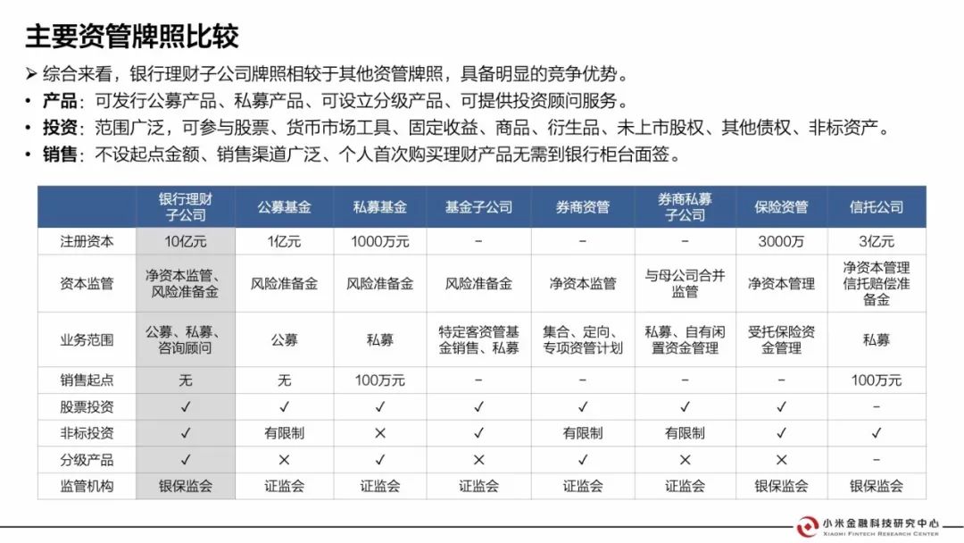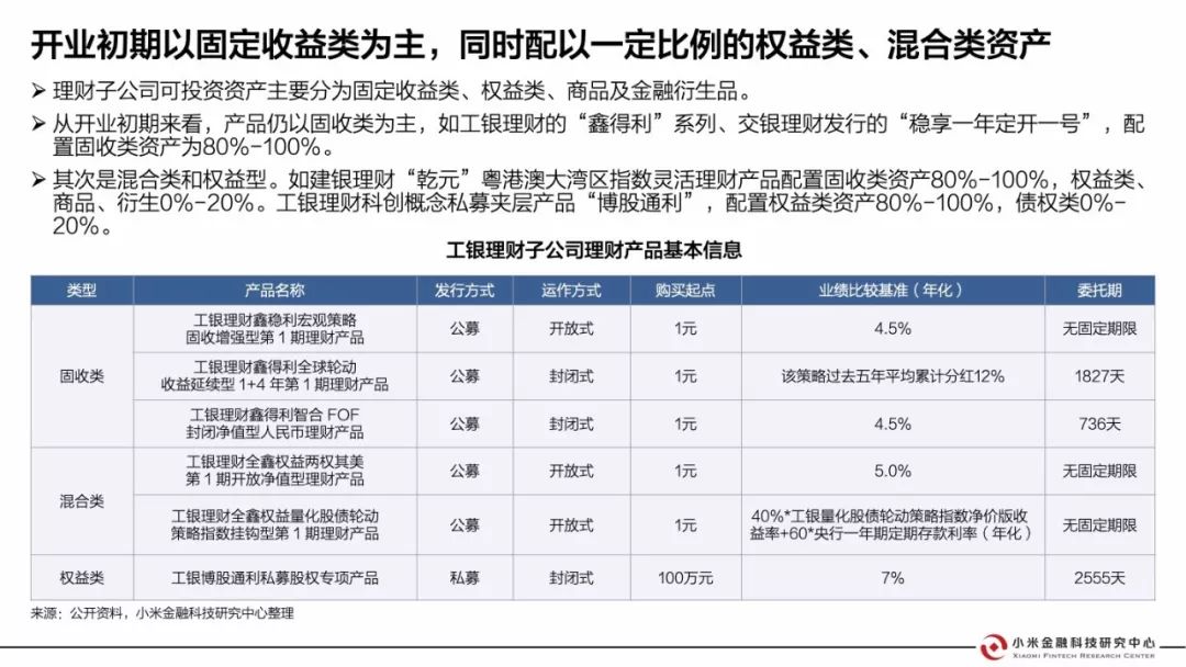 目前已有12家銀行理財子公司獲批,工、農、中、建、交已開業。各行原資管業務部門與理財子公司并行運作,但職責分工有所不同;均發行了理財產品,主要以固收類為主,混合類、權益類為輔。但目前還面臨一些問題:
