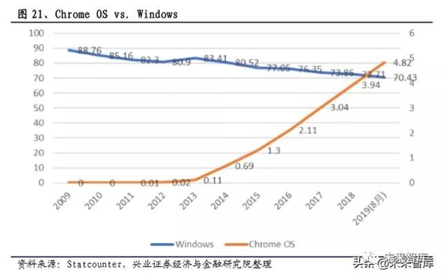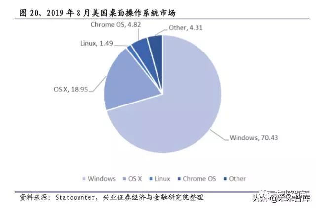 根據(jù)目前PC機(jī)21.8% 滲透率,中國存量計(jì)算機(jī)市場規(guī)模約為3億臺,微軟Windows 與蘋果 OS 市占率為 94.75%。