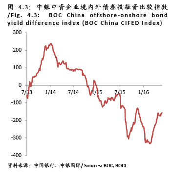 比如,境外相較境內(nèi)的 3 年期中國(guó)國(guó)債的收益率差由 4 月底的 72 基 點(diǎn)下降至目前的 64 基點(diǎn)(見圖 3.6),同時(shí) 中銀中資企業(yè)境內(nèi)外投融資比較指數(shù)(中銀 CIFED 指數(shù))較一個(gè)月前倒掛(負(fù)數(shù))幅度也有所減低(見圖 4.3)。