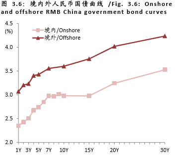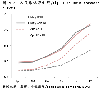 遠(yuǎn)期曲線隨即期匯率上行,但與 1 月份不同 的是,在岸遠(yuǎn)期曲線變得更為陡峭,離岸遠(yuǎn) 期曲線則大致平移。