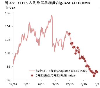 在此背景下,在岸人民幣兌美元匯率全月累計(jì)貶值 1.6%至 6.583。相比較,CFETS 人民 幣一籃子指數(shù)反彈至 97 以上,至 5 月 27 日 的 97.2(見圖 3.5)。盡管下半月中兌美元匯率陡然走弱,離岸和在岸人民幣之間的匯率 價(jià)差至月底仍保持在較窄區(qū)間變動(dòng)(小于 100 點(diǎn)子)。