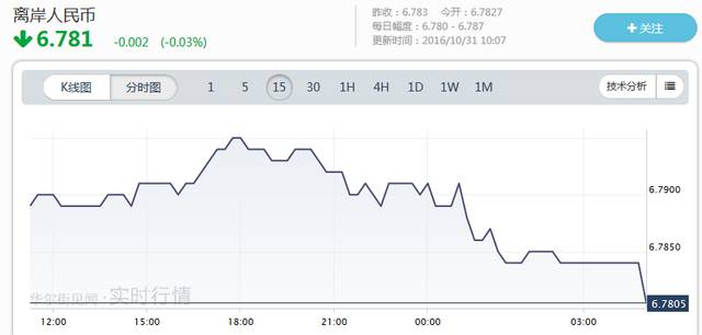 中間價公布后,在岸、離岸人民幣雙雙走高。在岸人民幣兌美元開盤報6.7702,上日收報6.7810。離岸人民幣兌美元上漲至6.781,稍早最低報6.7908。上周公布的美國三季度GDP初值增長2.9%,創(chuàng)兩年最快增速,美聯儲加息預期進一步強化。