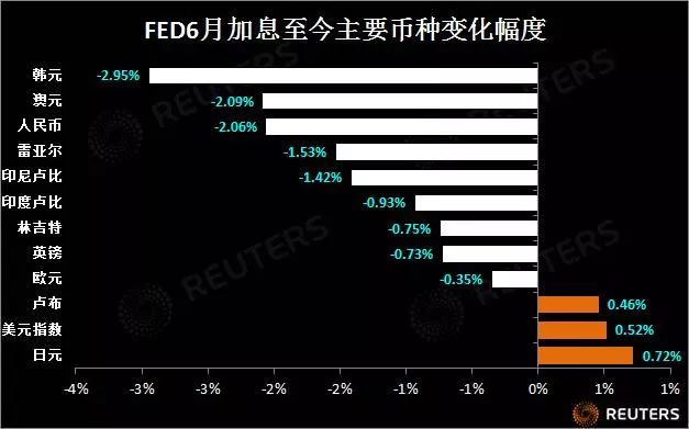 如果以6月12日收盤為基準,即美聯儲6月加息前一天收盤至今美元指數小升0.52%,人民幣兌美元累計跌2.06%,同期韓元跌2.95%,澳元跌2.09%,跌幅較人民幣略大;而雷亞爾、印尼盧比跌幅在1.45%左右;英鎊、歐元、印度盧比和林吉特等跌幅不過0.8%左右,和美指表現大體相仿。
