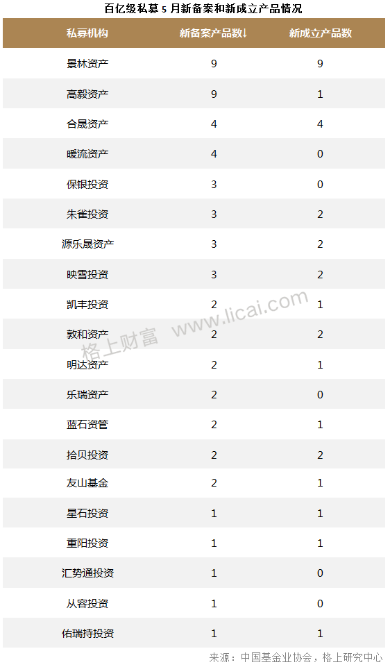 5月共20家百億級私募新備案產品57只,新備案產品數連續兩月下降