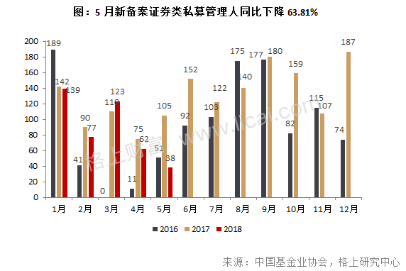 據基金業協會最新數據顯示,今年5月份新備案私募管理人160家,其中證券類私募管理人38家,同比下降63.81%,且與上月相比下降幅度達38.71%。5月無新成立的證券類私募管理人備案。