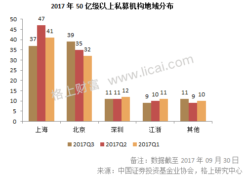 此外,格上研究中心發現,50億以上私募機構中北京和上海地位仍然穩固,但上海較上季度減少了10家,今年來首次落后于北京,北京則較上季度增加了4家。