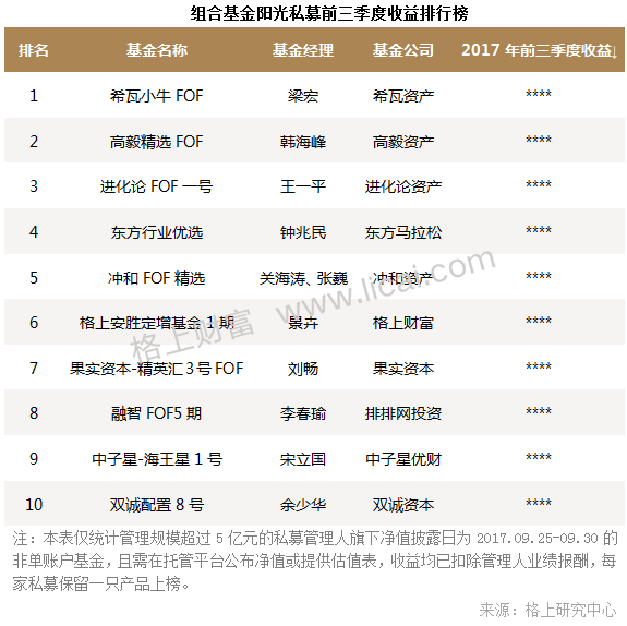 另外,格上研究中心發現今年上半年高毅資產旗下高毅精選FOF以23.17%的收益位居組合基金策略第一名。進入三季度以來,希瓦資產旗下的“希瓦小牛FOF”連續3個月取得組合基金策略榜首,據格上研究中心了解,該基金主要投向公司旗下兩只股票型基金,今年以來這兩只基金收益豐厚,主要布局了房地產、汽車、零售等領域。此外,格上理財旗下產品“格上安勝定增基金1期”連續2個季度進入組合基金策略前十,截至9月底,去除業績報酬后累計取得25.80%收益。