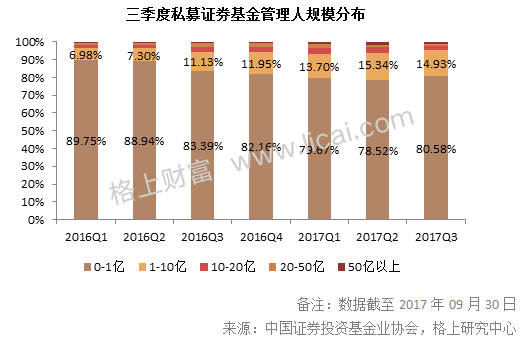 作為私募行業的中堅力量,格上研究中心統計發現,截至2017年三季度末,共有107家私募證券基金管理人的規模達50億以上,較二季度減少了5家。
