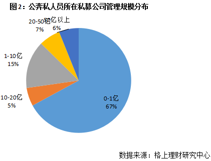 格上理財統計了公奔私人員目前所在的證券類私募管理人的管理規模,發現2.17%的公奔私人員所在私募管理規模在100億以上,5.76%的公奔私人員供職于規模在50億以上的私募機構,而67%的公奔私人員所在私募機構管理規模不足1億。