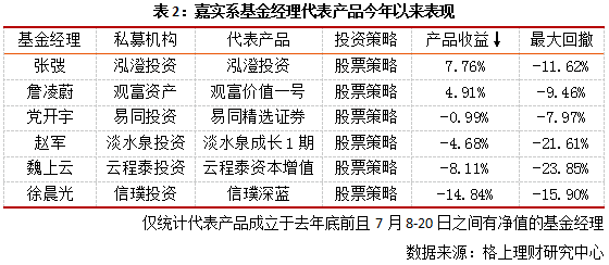 格上理財數據顯示,私募公司高管及基金經理中擁有嘉實基金從業背景的共44人,總量上雖然不及華夏,但其中依然不乏行業中的重量級人物,如淡水泉投資的趙軍、景林資產的田晶、蔣彤以及北京私募第一人云程泰投資的魏上云等。從業績來看,格上理財數據顯示,嘉實系今年以來平均收益為-3.97%,產品平均最大回撤為-18.02%。