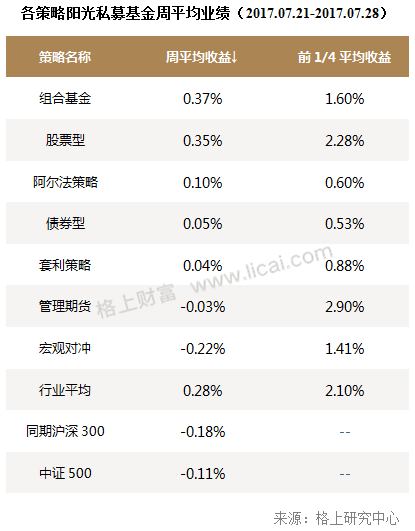 從各策略的業績表現來看,上周(2017.07.21-2017.07.28)除管理期貨與宏觀對沖策略以外,所有策略全部獲得正收益,且組合基金策略獲得了所有策略中最高的周度收益,為0.37%。墊底的宏觀對沖策略收益為-0.22%。