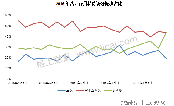 雖然整體調(diào)研數(shù)量有所下滑,但機(jī)構(gòu)對(duì)創(chuàng)業(yè)板的熱情卻格外高漲。整個(gè)8月份,創(chuàng)業(yè)板觸底反彈,漲幅遠(yuǎn)超其他指數(shù),同時(shí),機(jī)構(gòu)調(diào)研的創(chuàng)業(yè)板公司大幅提升至43.79%,環(huán)比上漲52.1%,和中小板平分秋色,共同占據(jù)了八成江山。而主板公司遭冷落,占比下降為18.93%。