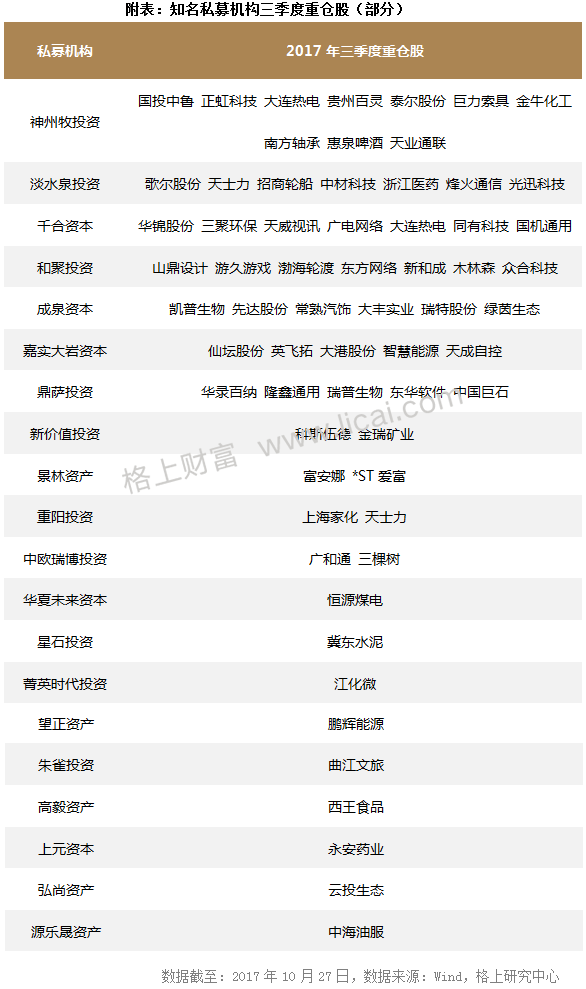 隨著上市公司三季報的陸續披露,知名私募的持股路徑漸漸浮出水面。格上研究中心根據Wind數據整理發現,截至10月27日,已有超過1800家上市公司披露了2017年三季報,有63家公司前十大流通股股東中出現“淡水泉投資”“千合資本”“和聚投資”等知名私募的身影,其中,與“社保基金”“中央匯金”等國家隊共同持有的個股有21只。