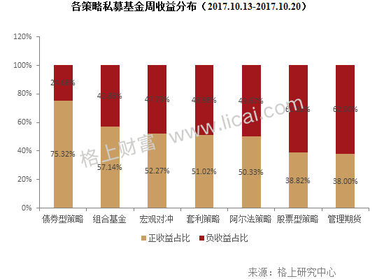 從各策略業績表現來看,上周(2017.10.13-2017.10.20)市場環境不佳,行業平均收益僅為-0.53%。其中,宏觀對沖策略奪冠,周漲幅0.18%;股票策略業績分化嚴重,績優產品收益達1.72%,排名第一,但全部產品平均收益表現較為靠后,僅為-0.64%。