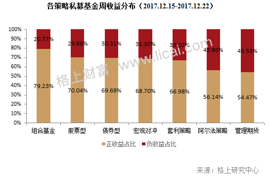 從各策略業績表現來看,上周(2017.12.15-2017.12.22)股票型策略奪冠,周平均收益0.82%,前四分之一產品業績3.59%,兩項均排名第一。組合基金正收益占比最高但是平均收益不及股票型。管理期貨策略正收益占比最低但是績優產品收益較為靠前,前1/4平均周收益達3.16%,僅次于股票策略,說明在市場行情較差時,仍有少部分績優產品能夠博取高收益。