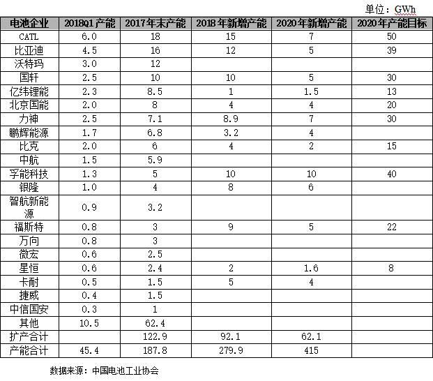 對主要電池企業目前公布的擴產計劃進行統計梳理,2018-2020年每年增加動力電池產能分別為92.1GWh、73GWh和62.1GWh;到2020年動力電池總產能有望達到415GWh。