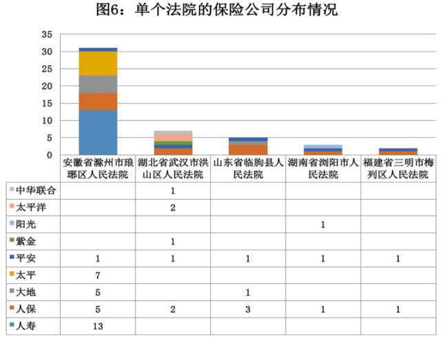 在適用訴訟財產保全責任保險的法院中,申請人選擇保險公司的自由意志、各保險公司的公平競爭權均得到較為充分的尊重。例如,安徽省滁州市瑯琊區人民法院的31個案例中,開展該險種的保險公司包括了人壽、太平、人保、大地、平安5個保險公司;湖北省武漢市洪山區人民法院的7個案例中,也包含了人保、太平洋、平安、紫金、中華聯合5個保險公司。該組數據表明在接受訴訟財產保全責任保險的法院中,各保險公司得到較為公平的對待,即便并存強大的競爭壓力,保險公司理應有強大的開拓該險種市場的信心。