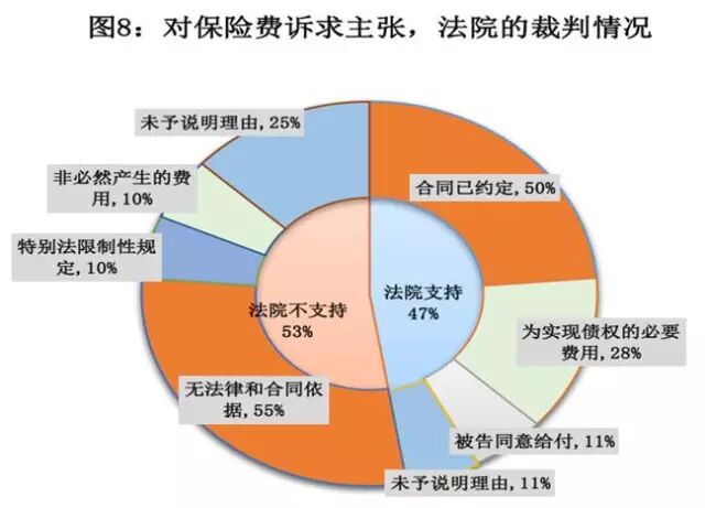 由于訴訟財產保全責任保險屬于創新的擔保方式,其產生的保險費用訴求能否得到支持尚有爭議。在38個原告要求被告承擔該費用的案件中,法院支持該費用主張的有18個,法院不支持的有20個。其中,超過一半的法院支持或不支持均基于雙方當事人在合同中對該部分費用的具體約定,典型如合同中約定違約方應承擔守約方為實現債權所產生的訴訟費、律師費、差旅費等所有費用。筆者認為,同律師費主張一樣,在無法律明確規定的前提下,該訴求能否得到認可僅能依賴于合同約定。