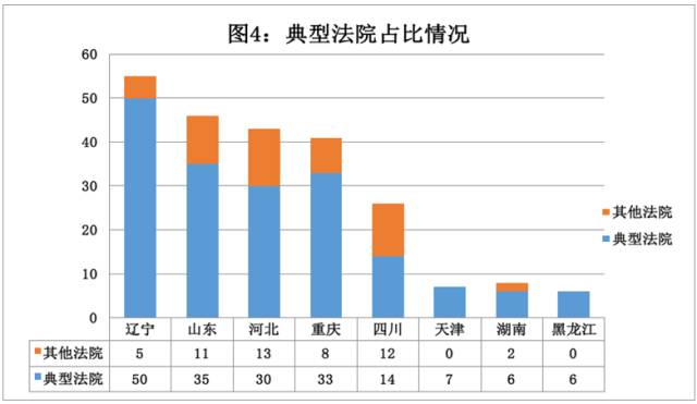另外,筆者以單個法院案例數量大于(包括等于)3個為標準設定典型法院。其中,遼寧省55個案例中,典型法院占了50個,占比高達90.91%;山東省46個案例中,典型法院占了35個,占比高達76.09%;天津市、黑龍江省的典型法院占比則高達100%。