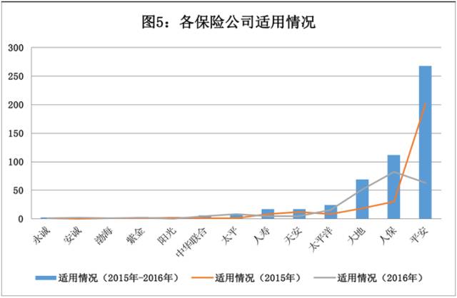 由于2014年適用訴訟財產保全責任保險的公開裁判文書較少。因此,此部分數據以2015、2016年為主。從趨勢圖可以看出,2015年各保險公司適用情況差別明顯,但相較2015年,2016年各保險公司在保全案件中適用該險種的數量則漸趨平緩,由此說明隨著訴訟財產保全責任保險的不斷實踐和條件的成熟化,保險公司在參與度提高的同時,其面臨的競爭壓力也明顯增強。