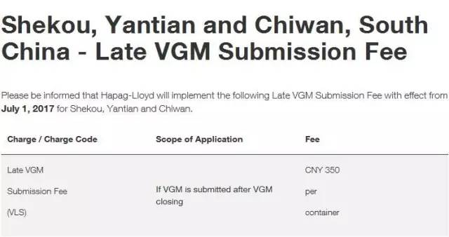 赫伯羅特(Hapag-Lloyd)在官網發布了公告,從7月1日起,針對深圳港口(鹽田,蛇口,大鏟灣),如果在VGM截止時間之后才申報VGM,將會征收遲VGM費用,收費標準為:350人民幣/柜。