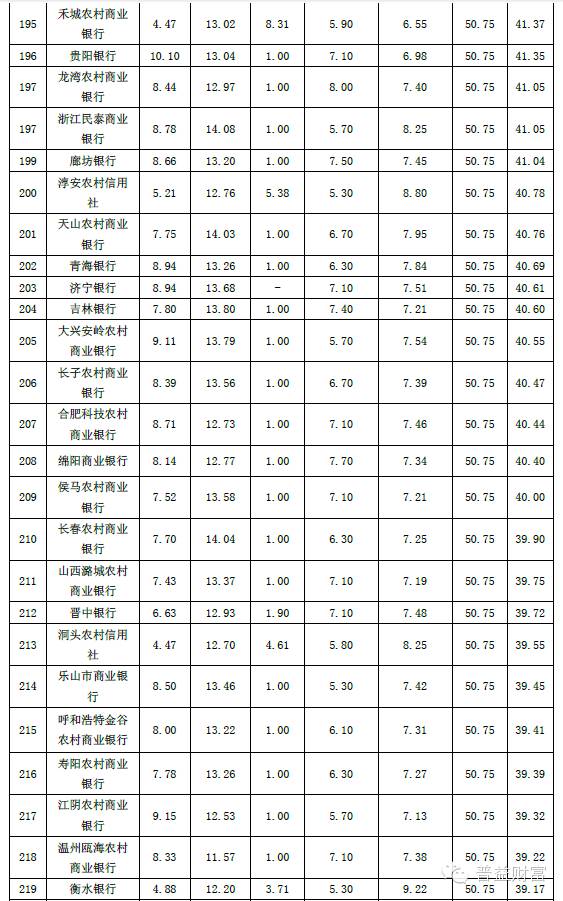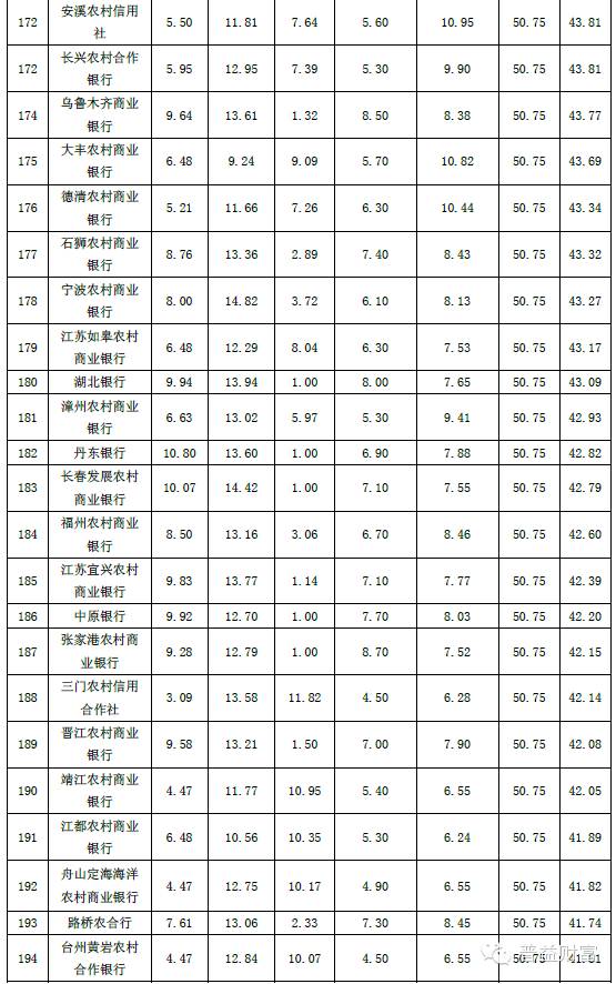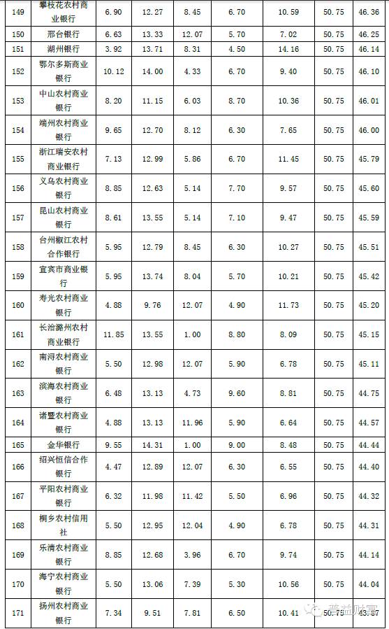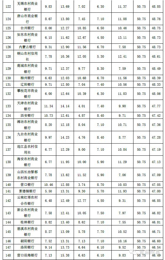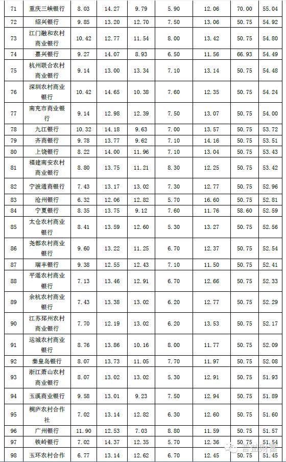排名前五的全國性銀行依次為華夏銀行、興業銀行、中信銀行、光大銀行和工商銀行。風險控制能力排名前十的區域性銀行依次為是南京銀行、杭州銀行、北京銀行、上海農商、福建海峽銀行、青島銀行、長沙銀行、漢口銀行、廣東順德農商、蘇州銀行。