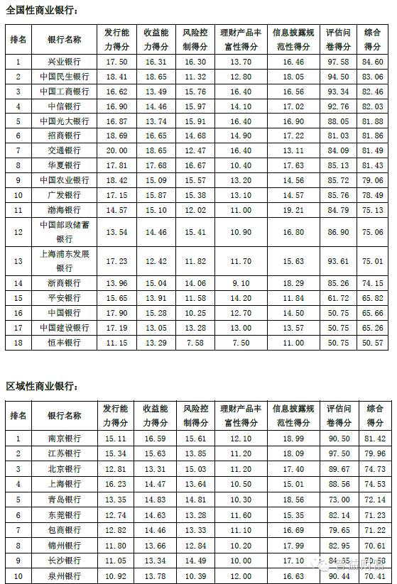 排名前五的銀行依次是興業銀行、民生銀行、工商銀行、中信銀行和光大銀行。理財能力綜合排名前十的區域性銀行依次為南京銀行、江蘇銀行、北京銀行、上海銀行、青島銀行、東莞銀行、包商銀行、錦州銀行、長沙銀行、泉州銀行。